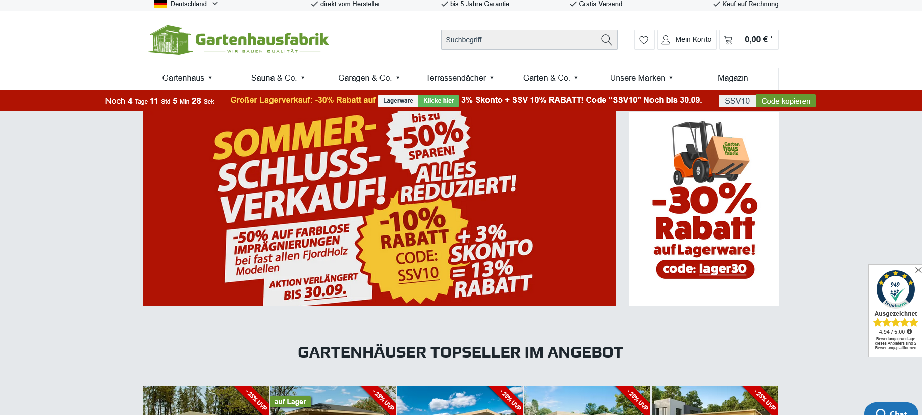 Was macht Gartenhausfabrik.de? Gartenhausfabrik.de ist Hersteller und Online-Händler von Gartenhäusern aus Holz. Das Unternehmen bietet Holzhäuser, Saunen, Garagen, Gartenhäuser und Terrassenüberdachungen direkt ab Werk an – mit bis zu 5 Jahren Garantie und kostenlosem Versand innerhalb Deutschlands. Der Verkauf erfolgt per Rechnungskauf und über Zahlungsoptionen wie Skonto. Dadurch entfallen Zwischenhändler und die Kosten für den Kunden. Produktangebot: – Gartenhäuser in klassischer, fünfeckiger oder Flachdachausführung – Außensaunen und Saunawannen – Holzgaragen und Carports – Terrassenüberdachungen und Veranden – Gerätehäuser – Gartenmöbel und Zubehör – Sonderanfertigungen und Modifikationen von Standardmodellen sind möglich. Bestseller Im Bereich „Topseller im Angebot“ finden Sie folgende Fjordholz-Modelle mit 25 % Rabatt auf den Verkaufspreis: – 5-stöckiges Gartenhaus…